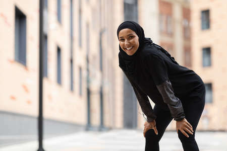 Cheerful tired young muslim female athlete in sportswear ,hijab with smartphone is resting after jogging
