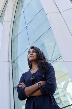 Young attractive beautiful Indian woman in dark blue formal jumpsuit look forward confidently crossed arm in front of a tall glass urban bundling