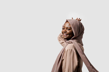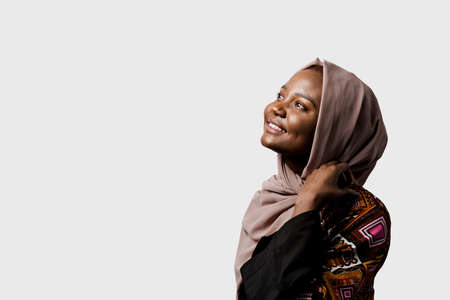 Dreamy black girl wear hijab smile and rejoice on white background. Muslim happy woman posing in studio. Attractive african female.