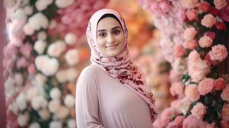 Portrait of a beautiful muslim woman wearing hijab against floral background