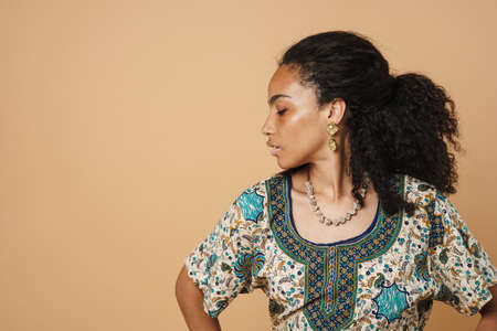 Young black woman wearing dress posing on camera isolated over beige background