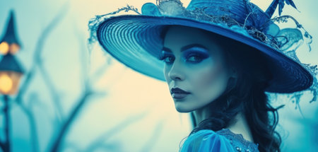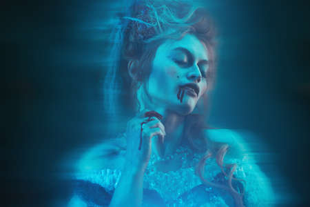 Halloween Close-up portrait of a charming and terrible woman vampire. Vintage style.
