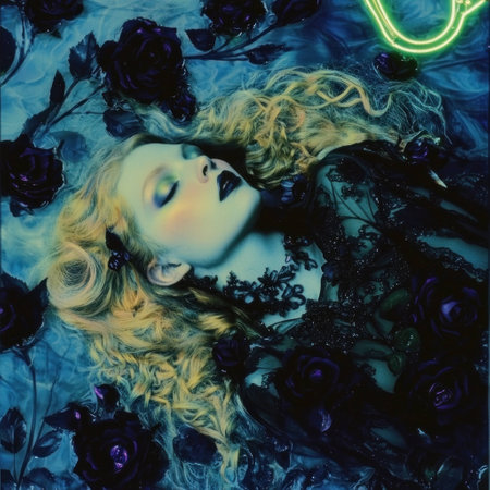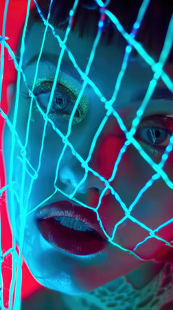 Captivating Neon Mesh Portrait of Mysterious Fair Skinned Woman with Striking Facial Expression and Alluring Gaze
