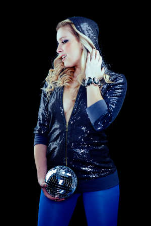 Blonde girl in style of party beauty posing with mirror ball in several dresses