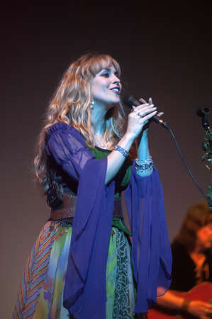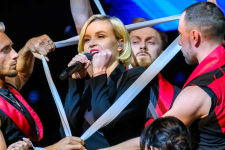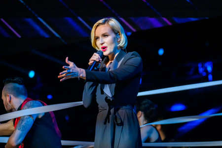 Moscow, Russia - April 23, 2018: Famous Russian singer Polina Gagarina sings in front of participants in the business forum