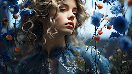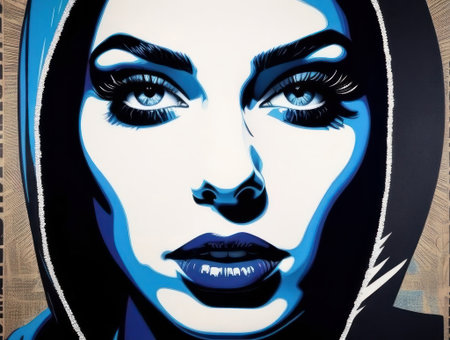 Stunning modern artwork featuring a woman's bold, blue face with piercing eyes and detailed features. Generated AI has crafted a visually striking and contemporary piece perfect for modern decor