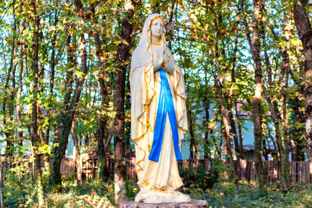 Statue of the Blessed Virgin Mary among ivy covered trees. Green weeds and grey rocks in a garden of Medjugorje