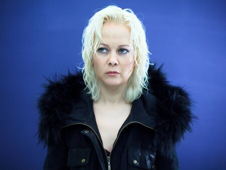 A woman with blonde hair and red jacket posing for a picture, AI