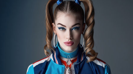 A captivating portrait featuring a young woman with a playful hairstyle and bold makeup. She wears a vibrant blue jacket and unique accessories, embodying contemporary beauty and youthful energy.