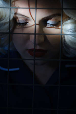 sad scared blonde behind bars close up portrait in moonlight