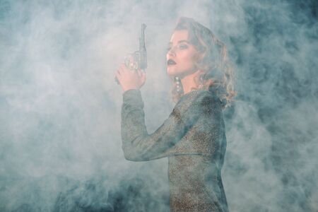 attractive and dangerous woman holding gun near smoke
