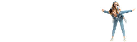 mother imitating plane with daughter on back isolated on white, panoramic shot