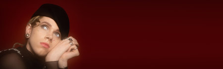 portrait of young queer person in beret holding hands near face and looking away isolated on brown, banner