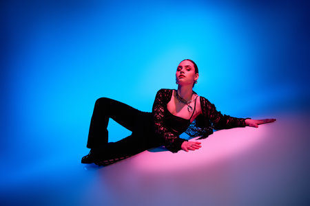 Attractive woman dressed in fashion apparel in neon night lights.