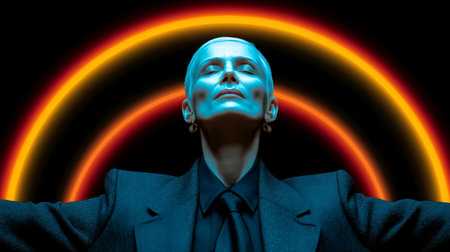 Confident woman with short hair stands against a dark backdrop, illuminated by colorful neon lights, expressing strength and empowerment in a striking visual composition