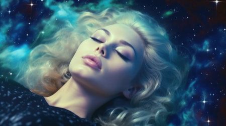 Close up portrait woman sleeping, floating outerspace with star nebula galaxy. Generative AI image weber.