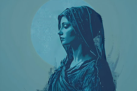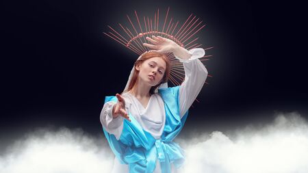 The Virgin Mary portrait with lilies on a dark background with rays of light. Modern art in religion.