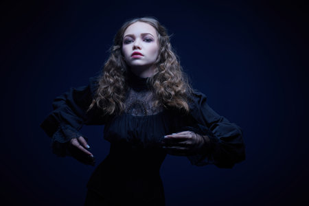 Vintage portrait of a beautiful pale lady in a black dress looking sad on a black background. Historical and mystical novel. Victorian style. Halloween. Copy space.