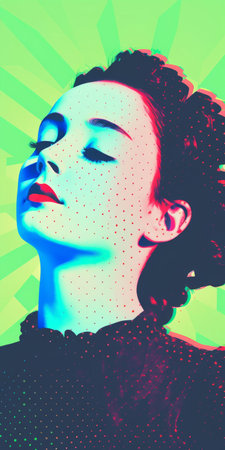 a minimalist portrait of a 19th-century starlet sunbathing takes center stage, surrounded by an 8-bit dots and colors orthonormal coordinate system. the faded lithography background, once vibrant with baroque details, now glows with anaglyphic kaleidoscopic aesthetics. light halftone dots complete the minimal psychedelic art piece, leaving viewers in awe of the vanished light. ai generated