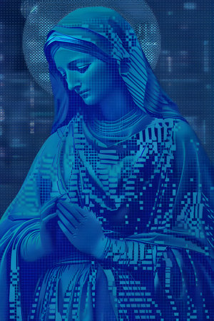 Digital Illustration of the Virgin Mary in a blue dress with a hood