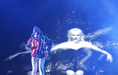 Girl with a slender figure in a fantastic mirror suit with a mask of mirrors performing in the arena