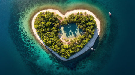 Aerial view of a heart-shaped tropical island with lush palm trees and crystal-clear waters. Generative AI