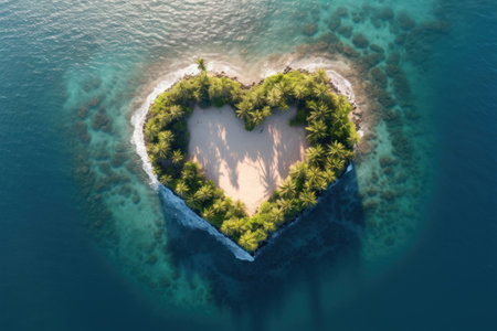 A stunning aerial view of a heart-shaped island featuring lush palm trees surrounded by vibrant blue waters, creating a serene tropical oasis perfect for getaway.