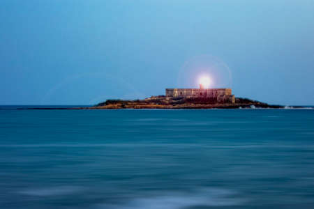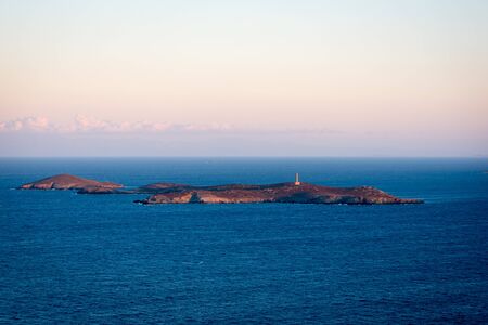 Small island with an isolated lighthouse in the sunset