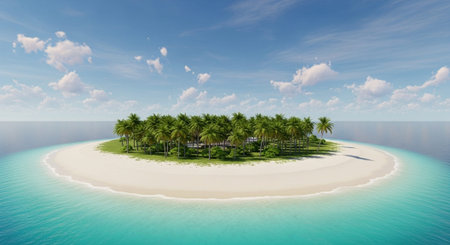 Breathtaking overhead view of a pristine tiny island ringed by crystal-clear turquoise waters, lush palm groves, and powdery white sands. Perfect for paradise travel ads, luxury resort banners, and exotic vacation promotions evoking ultimate seclusion.