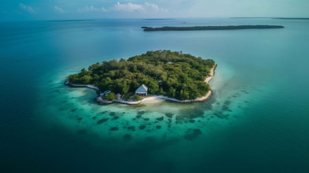 An aerial view showcases a small island with a building and lush greenery surrounded by crystal-clear turquoise waters. The composition presents a serene environment with vibrant colors and textures. This image is suitable for various commercial applications, including travel, tourism, and environmental themes, offering versatile visual appeal.