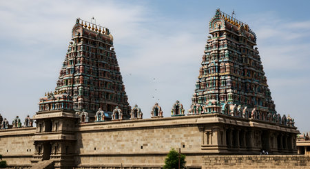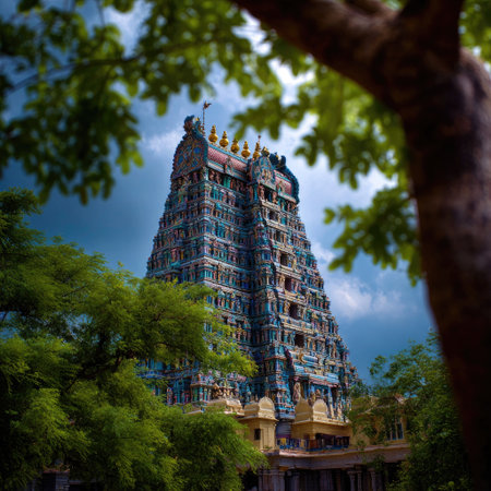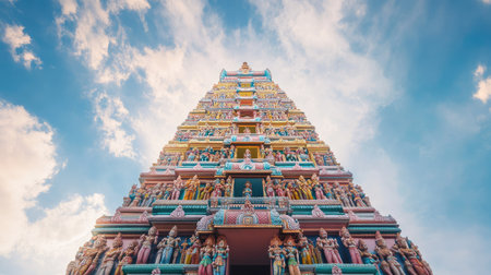 Temple Gopuram against the sky, with space for text below. Towering symbol of devotion.