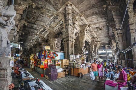 Madurai, India, November 12, 2018. Pilgrims and tourists walk around the market in the temple of Minakshi Sundareshvara, East Gate.