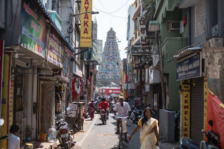 Chennai, India - February 8, 2020: View of Kapaleeshwarar Temple from an alley with unidentified people in traffic on February 8, 2020 in Chennai, India