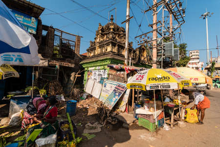 Trichy, Tamil Nadu, India - February 2020: An ancient Hindu temple next to a dilapidated house with street vendors sitting outside.