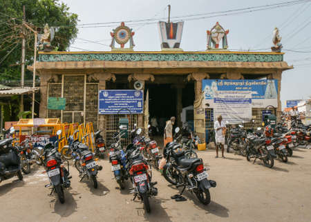 Trichy, India - October 15, 2013: Entrance to Anna Mandapam with Lord Vishnu symbols and avatars on top and a bunch of motorcycles in front. Symbols are Chakra, Conch, Flame, and Garuda avatar on both corners.