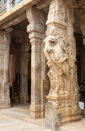 Trichy, India - October 15, 2013: Pillar forming statue of mythological beast, the Yali or Vidala, a combination of lion, horse or elephant. Fighter rides animal. Small elephant and sitting people in photo.