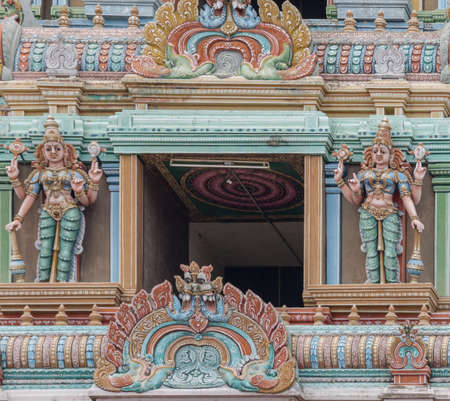 Trichy, India - October 15, 2013: Detail of the massive Rajagopuram of Ranganathar Temple. Focus on one opening protected by Dwarapalakas holding Vishnu symbols. Pastel colors pillars and statues.
