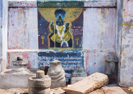 Trichy, India - October 15, 2013: Painting on shrine wall at Amma Mandapam of Lord Vishnu in royal lion avatar, called Narasimha. Seven headed cobra as background.
