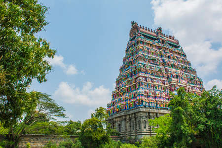 Trichy, Tamil Nadu, India - February 2020: The monumental entrance tower with carved mythological figures of the ancient Hindu Jambukeshwar temple in Tiruchirappalli.