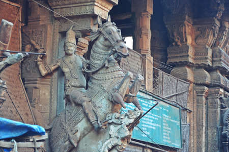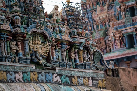 Madurai, India - October 19, 2013: Long shot on the top of one Vimanam on the Meenakshi Temple grounds. Detail of monster, dwarapalaka, bulls, lions, servants and more.