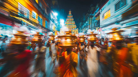 Vibrant Indian Maha Shivaratri Festival with Blur Motion of Procession and Illuminated Temple at Night. Concept of Cultural Celebration, Spiritual Festivity, Tradition, and Indian Heritage.