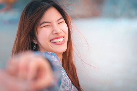 asian teenager smiling face happiness on summer vacation sea beach