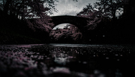 Pink sakura petals floating on serene river, ancient stone bridge in background, soft spring light, no people.