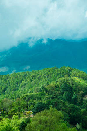 Scenic view of misty mountain in rain season at Doi Pha Hee, Chiang Rai, Thailand.