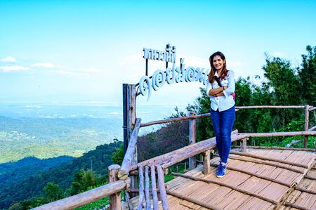 Young woman sitting on a mountain top at Phu Sing, Hin Sam Wan, Buengkan, Thailand