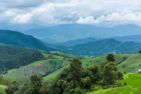 Growing green rice terrace Among the rich forests Of rural villages In Chiang Mai, Thailand