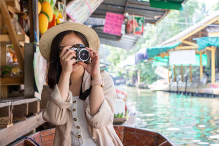 asia female tourists wearing hat holding camera and smartphone take photo vlog live . Beautiful woman take taxi boat visiting Damnoen Saduak floating market,Ratchaburi.