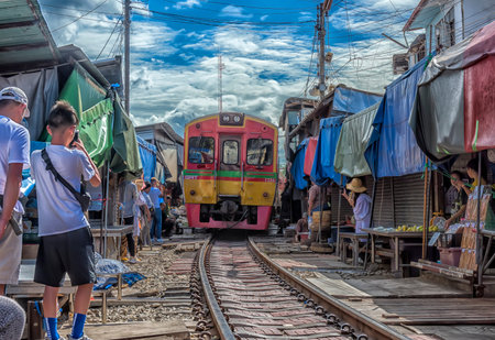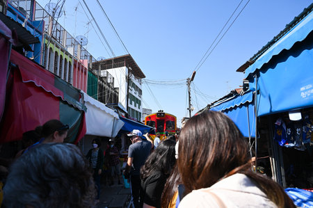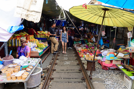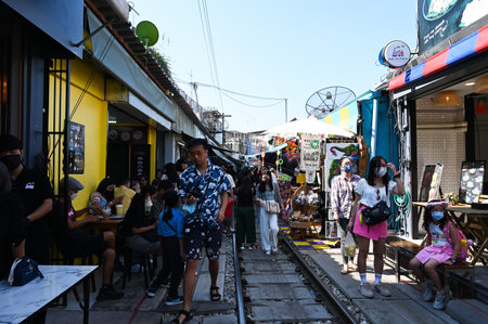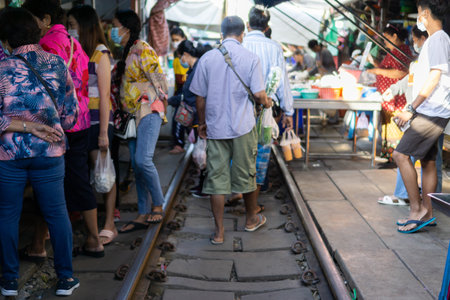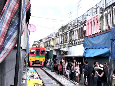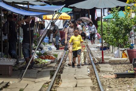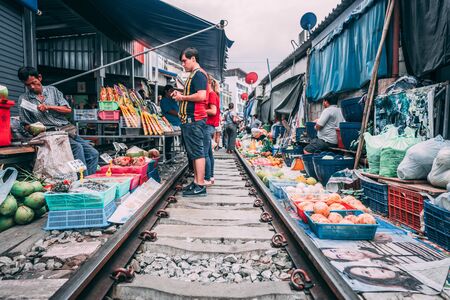 Samut Songkhram, Thailand - August 24, 2019 : Tourist shopping at market on the train tracks of Mae Klong market