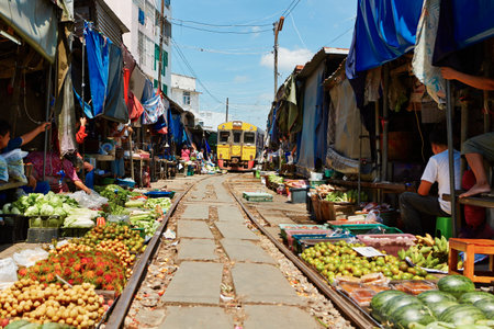 MAEKLONG, THAILAND - MAY 21 Railway market on May 21, 2014 in Maeklong, Thailand Train passing through local market is popular tourist attraction 80 km far from Bangkok