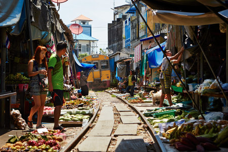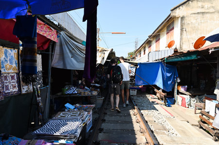 MAEKLONG, THAILAND - MAY 13, 2019: Maeklong Railway Market is popular among the tourists, visiting it to see the riding train and make some shopping in exotic place, on May 13 in Maeklong